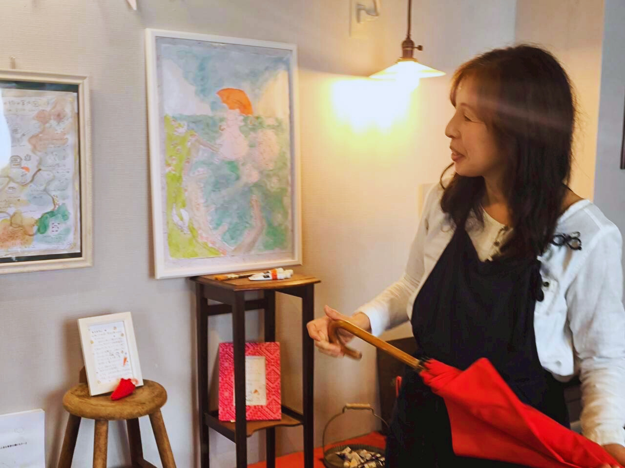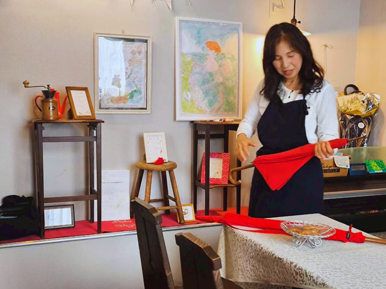 赤い傘は、オープンの日にプレゼントしてもらったもの。